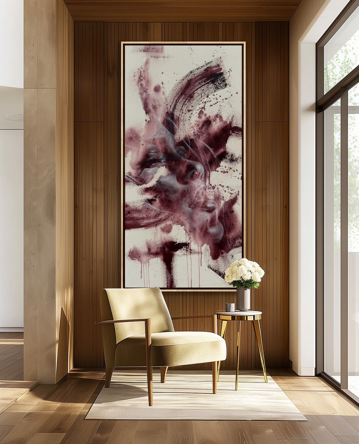Her paintings begin with spontaneous brushstrokes, letting the background unfold intuitively. She then steps back and reflects on what’s emerged before drawing something intentional within the abstract layers she’s created. At the core of her process is a mirror and conversation with herself, drawn from her own journey of self-discovery.